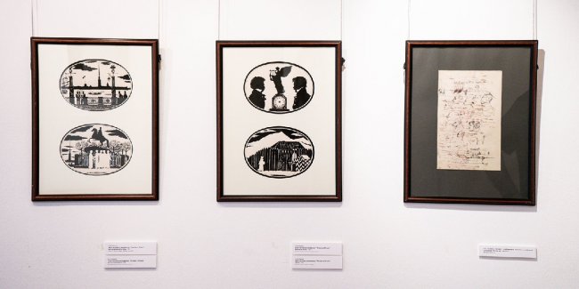 Здесь же представлены воспроизведения пушкинских рукописей, на полях которых поэт изображал П. И. Пестеля, С. П. Трубецкого, П. К. Каховского, К. Ф. Рылеева, В. К. Кюхельбекера, И. И. Пущина и других.