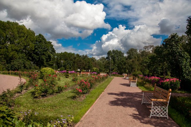 Открытие большого розария в парке «Сокольники» 2020Прогуляться по большому розарию горожане могут по главной дорожке, которую выложили красной брусчаткой. Многочисленные пешеходные тропинки засыпали мелким гравием такого же цвета. По всей территории розария расставили белые скамейки с подлокотниками, а для спокойного уединенного отдыха установили кованые ажурные беседки. Также розарий украсили белыми декоративными арками и трельяжами для вьющихся растений. В углах розария теперь есть качели.