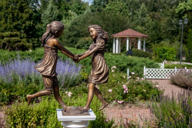 В обновленном розарии появилась парная скульптурная композиция «Детство». Она состоит из двух небольших фигур — бронзового мальчика-скрипача и двух девочек, держащихся за руки. Скульптуры установлены на отдельных мраморных постаментах в виде греческих дорических колон. Полюбоваться ими можно в саду ароматов (справа от свадебного павильона).