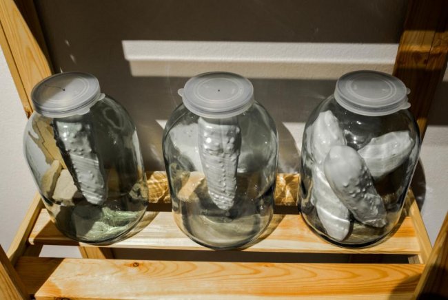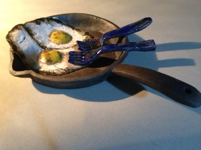 До трапезы, впрочем, дело не дойдет: все поданные яства «приготовлены» художниками из обожженной глины и абсолютно несъедобны. По виду некоторые из них могут напомнить майоликовые блюда с рельефными изображениями лежащих на них рыб, которыми знаменит мастер французского Возрождения Бернар Палисси.
