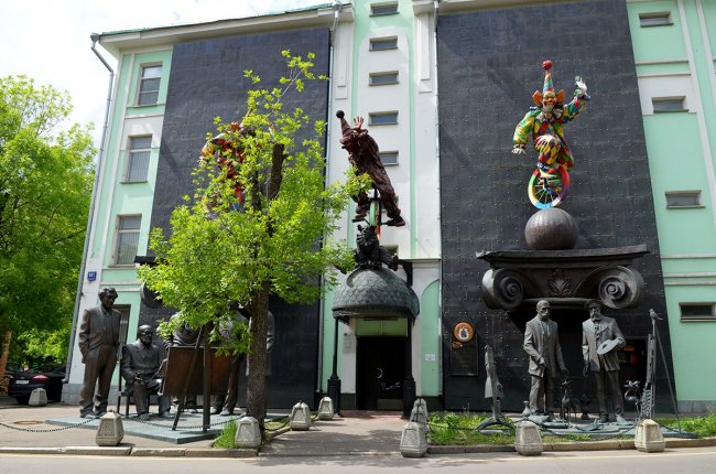 На фасаде пристройки — веселые клоуны. Эти огромные, ярко раскрашенные скульптуры придали обычному зданию праздничный, фантастический характер. Площадка перед особняком, часть Грузинской площади, превратилась в музей под открытым небом.