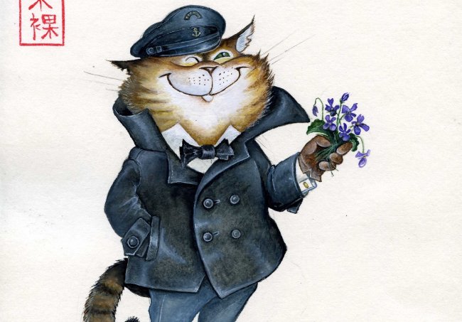 Большинство котов несут букеты цветов — тоже своеобразный привет и подарок для любимой. Все цветы автор рисовал, внимательно изучив ботанические атласы, чтобы сделать букеты максимально реалистичными. Каждый рисунок сопровождается строчками стихотворений собственного сочинения.