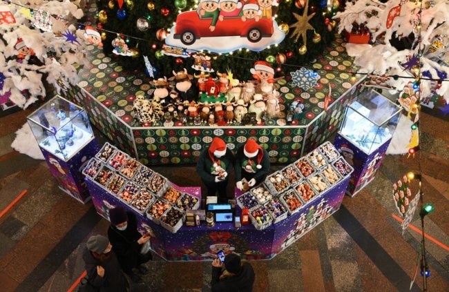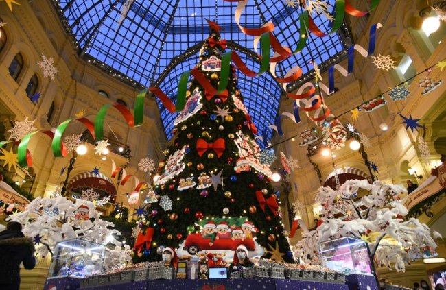 В центре ГУМа, на месте фонтана, под огромной праздничной елкой, раскинулась красочная новогодняя ярмарка.