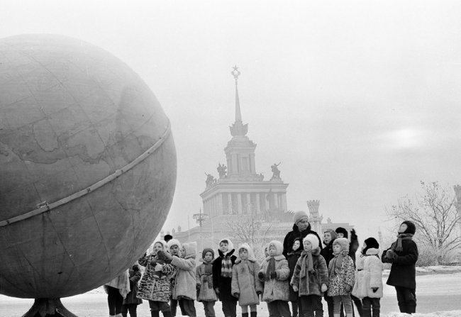 Одной из таких работ стала фотография Чернова, на которой можно увидеть дошкольников на площади Колхозов (в настоящее время — площадь Дружбы Народов), приехавших зимой 1965 года на экскурсию по Выставке. Группа детей с изумлением осматривает огромный глобус, а за их спинами легко узнается Центральный павильон.