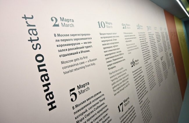 Экспозиция в Музее Москвы состоит из четырех разделов: «Начало», «Пик», «Плато» и «После». Каждый фиксирует определенную эмоцию, которая связана с хроникой распространения инфекции в Москве. В разделе «После» специальное место отведено артефактам второй волны.