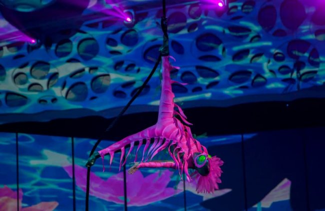 Цирковые артисты выполняют сложнейшие трюки без страховки — на высоте 10 метров над зрительным залом и гигантской водной чашей, где выступают морские животные. Головокружительные акробатические элементы в воздухе и прыжки в воду с огромной высоты поразят даже самых искушенных зрителей.