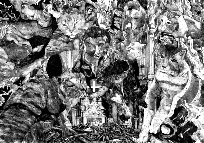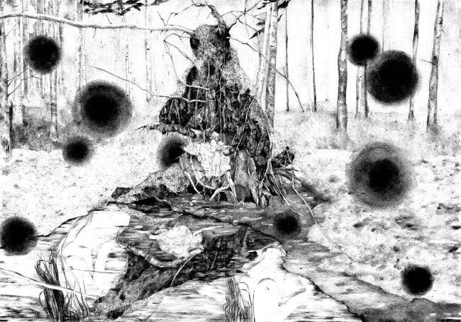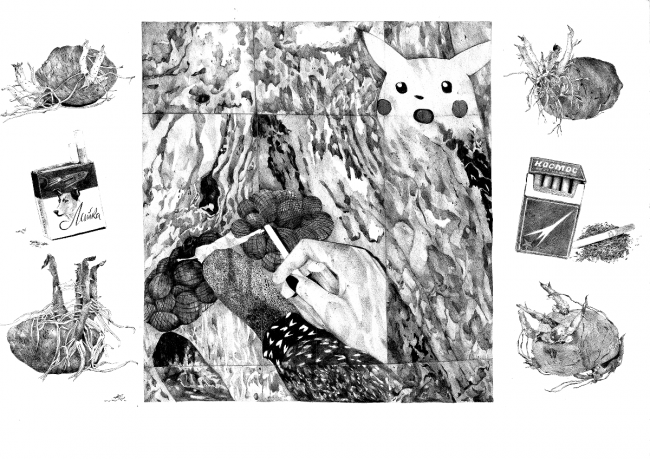 Максим Фарготоф о выборе проекта: «Конструкция образов в тонкой графике у Евы превращает простое разглядывание работ в философскую медитацию над образами. Это искусство, которое при каждом приближении может рассказать новую историю или подкинуть новый нарратив для размышлений. Техника Евы переносит работу с шариковыми ручками на новый уровень, который до этого, как казалось, находился в выжженном поле».