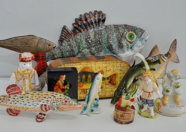 Большая часть выставки будет посвящена рыбам. Московский коллекционер Александр Ключарев представит обширное собрание самых разных предметов этой тематики: от натюрмортов, всевозможных статуэток и настенных панно до консервных ножей и портсигаров.