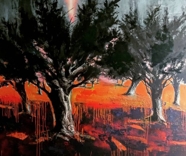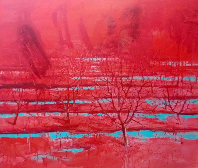 Именно это позволяет рассуждать о предчувствии катастроф, обращаясь к разным временным точкам: не только настоящее отражено в картинах Владимира Мигачёва, но также будущее и прошлое. Последнее будет представлено, помимо прочего, в неочевидном ключе. Две работы из серии «Весна 20/20», на которых изображены цветущие деревья в контражуре, не только являются гимном начала новой жизни и надежды, но несут в себе символическое отражение тревожных событий того времени. Начало пандемии, всеобщая изоляция и шаг в неизвестность — всем этим буквально пропитаны картины.