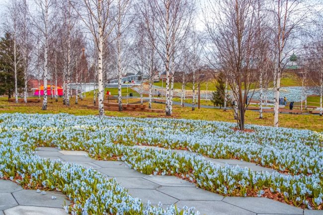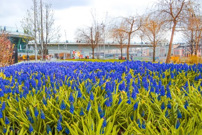 Проект «Волны цветения» в парке «Зарядье» 2022Гости парка уже в скором времени увидят запоминающиеся цветочные массивы, к концу апреля здесь зацветут первоцветы — посаженные под зиму луковичные: хионодоксы, пушкинии, мускари, крокусы и анемоны.