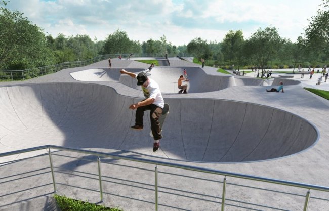 На ее создание архитекторов вдохновил известный берлинский скейт-парк. На площадке нет резких граней, наклонных перил и классических фигур, а грамотное расположение дорожек позволяет кататься без прыжков и потери скорости.