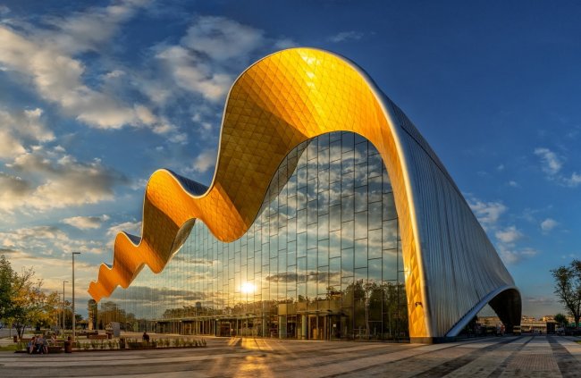 Дворец гимнастики Ирины Винер-УсмановоиПятиэтажное здание возвели по индивидуальному проекту с помощью BIM-технологий. Его узнаваемым символом стала уникальная крыша — она выполнена в виде развивающейся гимнастической ленты. Покрытие кровли выполнили по итальянской технологии с применением промышленного фальца, которое изготовили специально под сложную геометрию крыши.