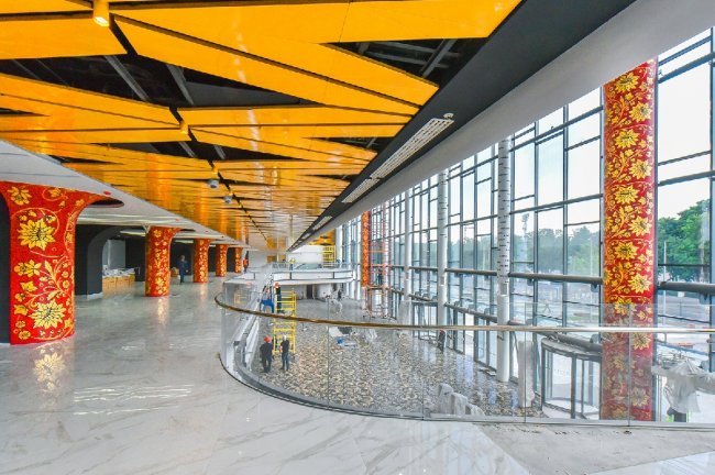 Конструкция крыши не только красивая, но и прочная. Испытания в аэротрубке показали, что она выдержит любые ветровые и снеговые нагрузки. Другая особенность здания — фасад. Для его отделки применили витражное остекление высотой 25–26 метров. Цвет стекла — различных оттенков, в определенных зонах оно будет затемняться.