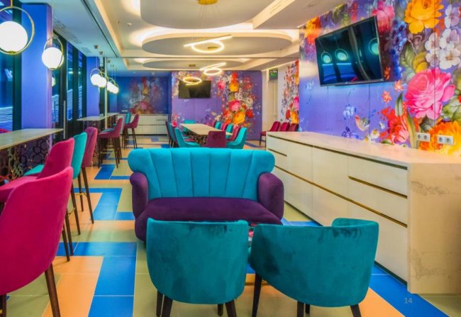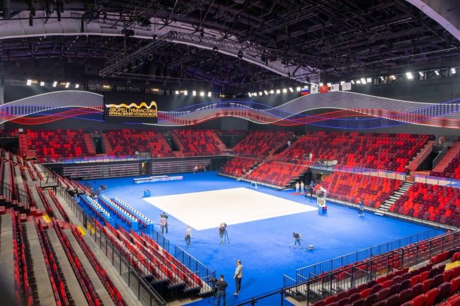 Дворец гимнастики Ирины Винер-УсмановоиДизайн интерьеров утверждала лично Ирина Винер-Усманова. Основную цветовую гамму арены создают бордовые кресла в пиксельной раскладке. Тренировочные залы и зал хореографии выполнили в светлых пастельных тоннах. Яркие цвета: желтый, оранжевый, синий, зеленый, красный использованы в оформлении столовой, буфета и гостиницы для спортсменов. В отделке вестибюлей Дворца гимнастики применена мозаика с индивидуальным дизайном — с использованием узоров из русской живописи (хохлома, гжель).