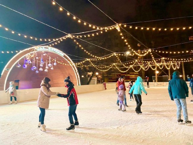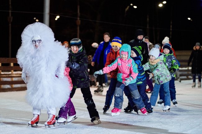 Бесплатный каток с искусственным льдом для всех желающих. Искрящийся на свету лед, легкость скольжения, звонкий смех — все это секреты хорошего настроения и заряда бодрости на целый день. В прокате рядом с катком можно взять коньки и помощников фигуристов. Рядом с катком работает кафе с горячими напитками и снеками.