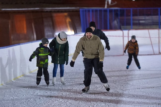 Каток состоит из двух ледовых площадок: одна с искусственным льдом на 800 м² (работает и в период потепления благодаря встроенным холодильным установкам!), другая — с натуральным ледовым покрытием на 600 м².