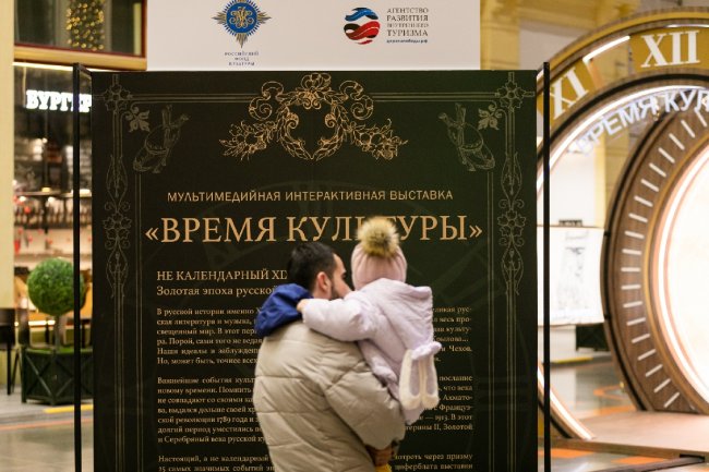 «Время культуры» — познавательное путешествие в Россию 19-го века через призму культурных событий. Центральный объект мультимедийного проекта — огромный циферблат часов — символ течения времени.