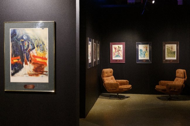 В состав экспозиции вошли литографии из серий «Кармен» (8 избранных работ из уникального издания 1968 г.), «Приключения Алисы в Стране Чудес» (12 работ, 1969/1984 г.), «Далинианские лошади» (18 работ, 1972/1983 г.), а также 20 иллюстраций к повести Педро де Аларкона «Треуголка», выполненные в технике ксилографии в 1958 г.