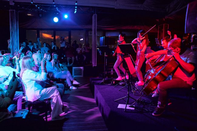 Представьте: солнце уходит за горизонт, над головой россыпь цветных гирлянд, а на столиках — свечи. На сцене эффектный дуэт скрипок с виолончелями «поет» «Dancing Queen» — и кажется, вам снова, ну, максимум лет 20, и жизнь — это бесконечный праздник!