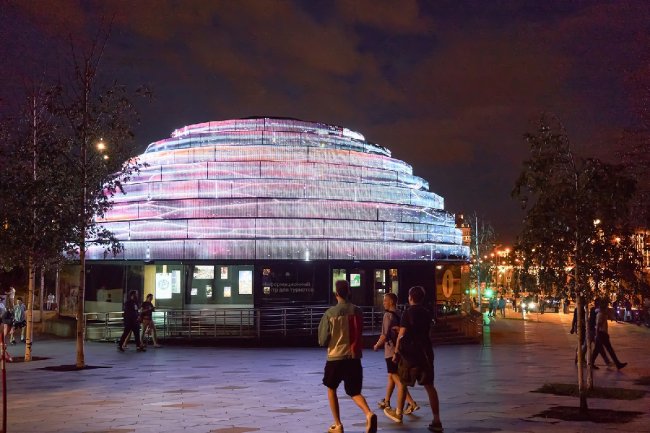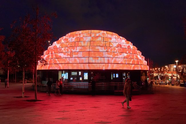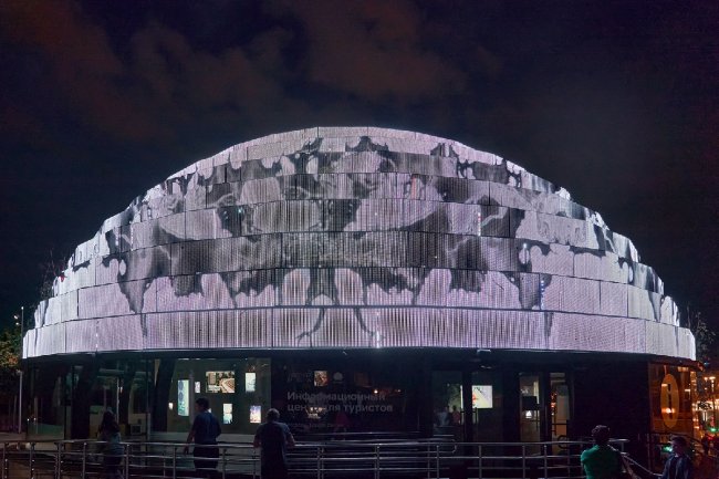 Медиафасад туристско-информационного центра Москвы в парке «Зарядье» не в первый раз становится местом показа произведений цифрового искусства. В марте 2023 года Мостуризм и платформа цифрового искусства Masters Digital провели художественную акцию «Бесконечное настоящее». В течение двух месяцев на куполе инфоцентра воспроизводилась цифровая графика в виде монументальных часов. Она создавалась в режиме реального времени с помощью технологии генеративной графики.