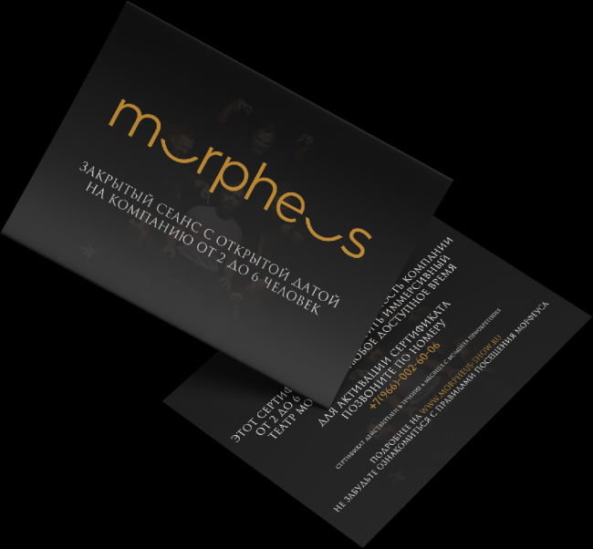 «Морфеус» предлагает приобрести сертификат с открытой датой спектакля на 1 персону, на 2 лица или на просмотр постановки только своей компанией. Спектакли проходят в камерной обстановке: на каждом сеансе от 2 до 8 зрителей (исключение составляет «Судный день», в котором участвуют 14 человек). Спектакли театра станут необычным подарком, их можно посетить с друзьями, семьей, коллегами и любимым человеком.