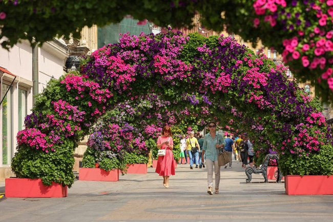 Центральные пешеходные улицы Москвы будут украшены с помощью цветочных арок и зеленых стен, композиций из деревьев, кустарников и многолетних растений, создающих затененные пространства среди городской суеты.