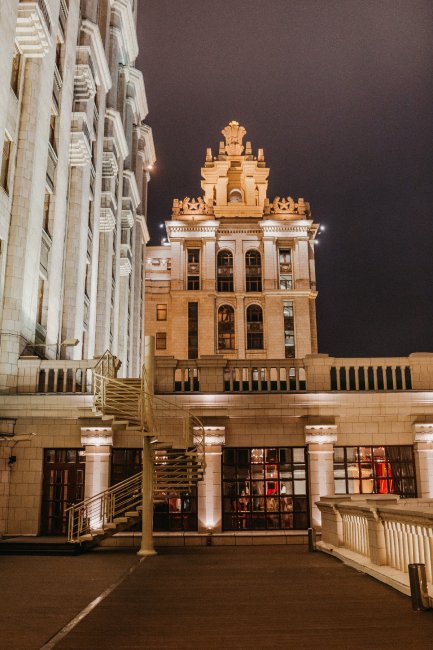 Внутри роскошной исторической высотки Radisson Collection вас ждет заботливый персонал, вкусная кухня, бар, потрясающий вид на центр Москвы с открытой веранды и два часа под волшебные звуки арфы, перкуссии, рояля, скрипки и контрабаса.