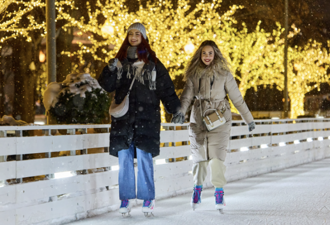 На центральной площади построен новый сезонный каток с искусственным льдом. Раздевалка и прокат коньков — к вашим услугам. Отдыхайте и катайтесь красиво, как в кино.