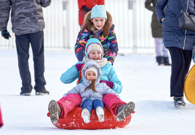 Тюбинговая горка приглашает детей и взрослых. На ней два спуска — для «маленьких» и «больших». Уклон хоть и не экстремально крутой, но есть возможность прокатиться с ветерком.