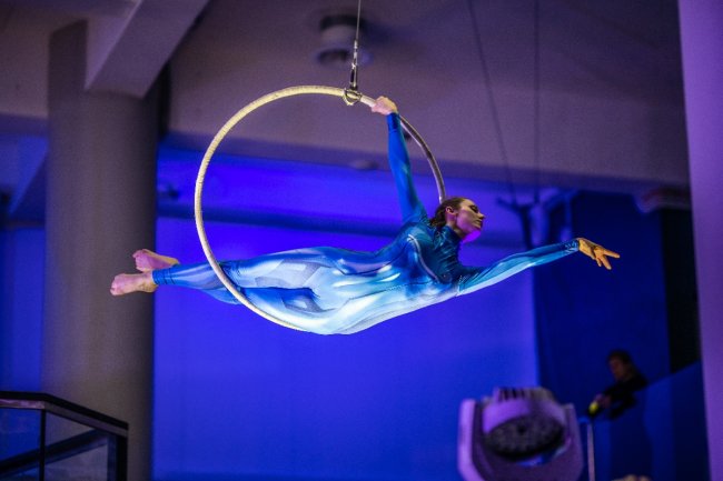 Аэроёлка 2025Космический театр появился в 2017 году и завоевал признание зрителей не только в России, но и зарубежом. Теперь артисты могут летать прямо в потоке воздуха, без использования опоры на полотна или ремней.