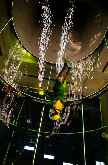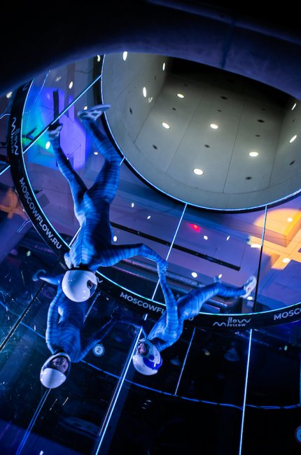 Полет выполняют чемпионы России и мира по фристайлу в аэродинамической трубе: