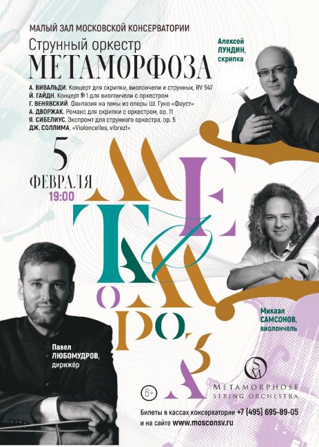 Концерт Струнного оркестра «Метаморфоза» 2025Оркестр «Метаморфоза» под управлением маэстро Павла Любомудрова исполнит жемчужины классики. Вы услышите искрящийся жизнелюбием концерт Антонио Вивальди для скрипки, виолончели и струнных RV 547, изящный и лёгкий 1-й виолончельный концерт Йозефа Гайдна, фантазию на темы из оперы Ш. Гуно «Фауст» для скрипки с оркестром Генриха Венявского, редкой красоты романс для скрипки с оркестром op. 11 Антонина Дворжака, элегантный Экспромт для струнного оркестра op. 5 Яна Сибелиуса и яркое произведение сицилийского композитора Джованни Соллима «Violoncelles, vibrez!» (солист — Арсений Котляревский). Также вас ждёт многое другое в программе.