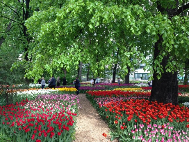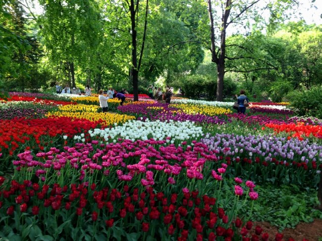 В начале мая распустятся яблони, груши, сливы, абрикосы, черешни, миндаль, рябчики, черёмуха. В середине мая — пик цветения 100 тысяч тюльпанов, в конце месяца — громадные пионы, сирень и рододендроны.