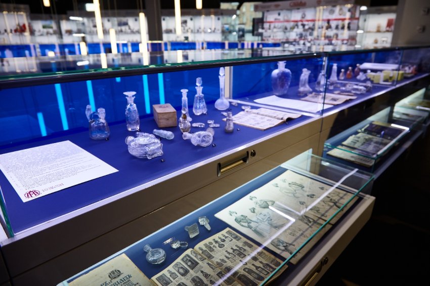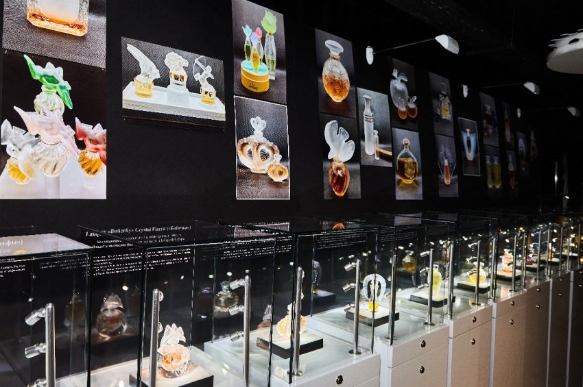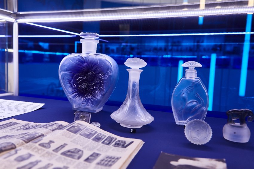 Одной из жемчужин коллекции является гиганский хрустальный флакон с голубями, созданный М. Лаликом для культового аромата L’Air du Temps. Экспозиция включает и флаконы для парфюмерии Мари Клод Лалик, которая не только продолжила стекольные и ювелирные традиции семейной фирмы, но и с 1992 года ввела парфюмерную линию. Первый аромат она посвятила памяти предков, назвав его Lalique de Lalique.