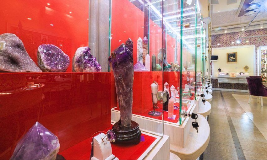 Более 1000 уникальных экспонатов от древних редких минералов, удивительных метаморфоз до современных ювелирных шедевров. Коллекционные минералы, цитрины и топазы, аметисты, жемчуг, гранаты и рубины и это лишь малая часть сокровищ, которые можно увидеть и потрогать.