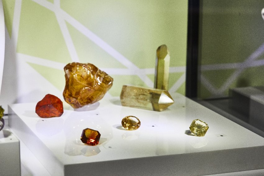 Выставка «Путь самоцвета»Тематические витрины с турмалинами, бериллами, гранатами, кварцем и другими минералами содержат информацию про каждый конкретный минеральный вид. В витринах представлены коллекционные образцы кристаллов, ограненные камни, а также геммологическое и ограночное оборудование, эскизы и готовые ювелирные украшения.