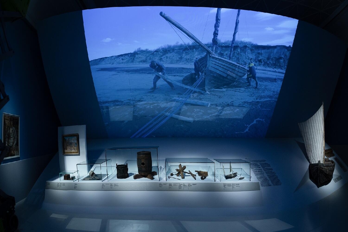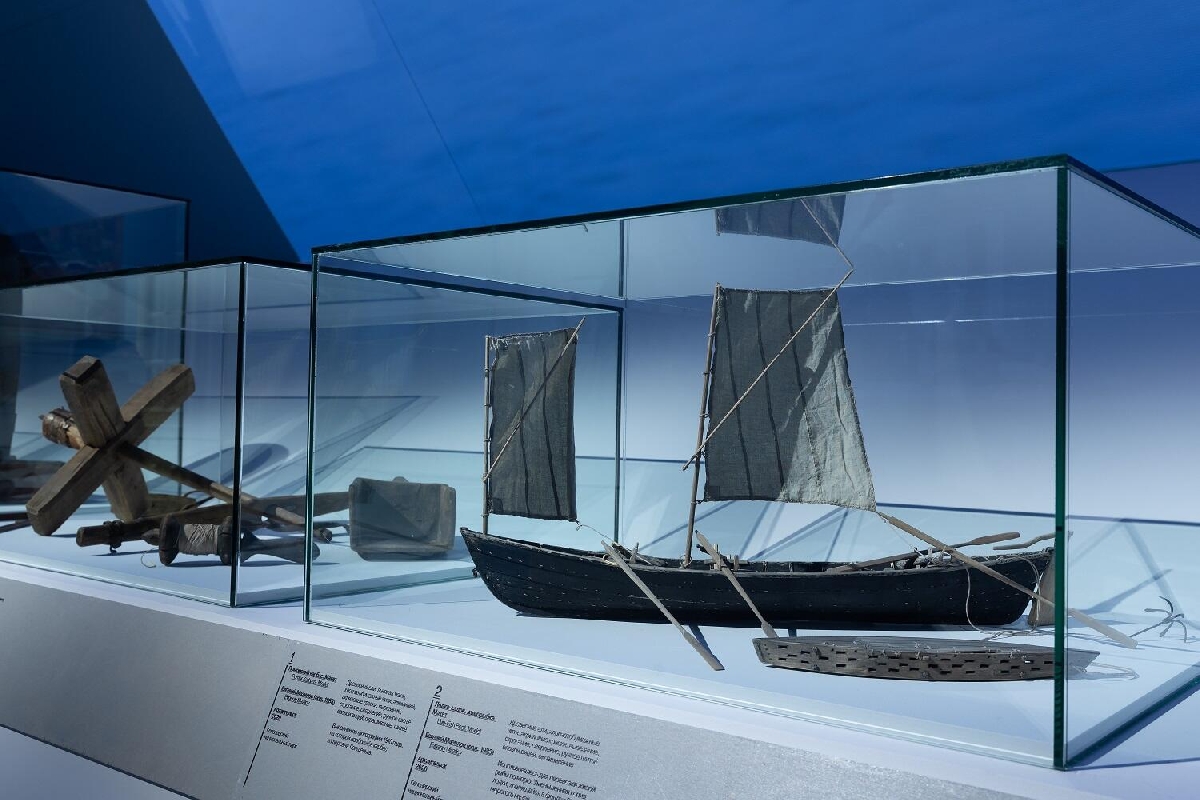 Ниже него расположены витрины с древностями, выше — фотографии, топографические карты, старые книги, живописные картины, акварели и другие предметы из собрания тринадцати музеев, трех государственных архивов, нескольких научных институтов, библиотек и частных коллекций. Всего в экспозиции 837 экспонатов. Среди них — фигурка медведя IV–III тысячелетий до нашей эры и топор эпохи раннего неолита, найденные во время многочисленных северных экспедиций.