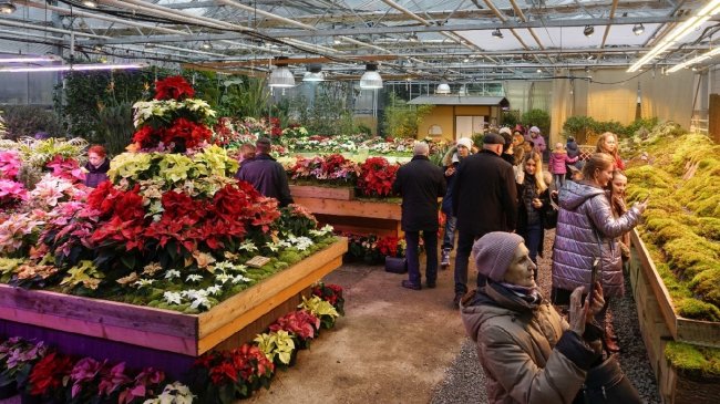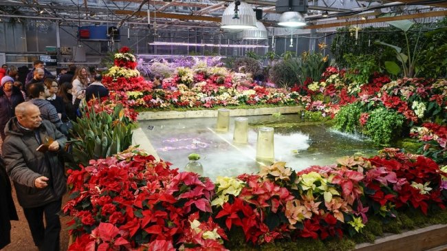 На входе в оранжерею гостей сада встретит уникальное новогоднее дерево — пышная азалиевая «елка», усыпанная цветами. Сотни разноцветных «рождественских звезд» — живых мексиканских пуансеттий, или молочаев красивейших, — наполнили оранжерею атмосферой Нового года.