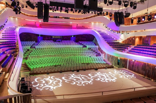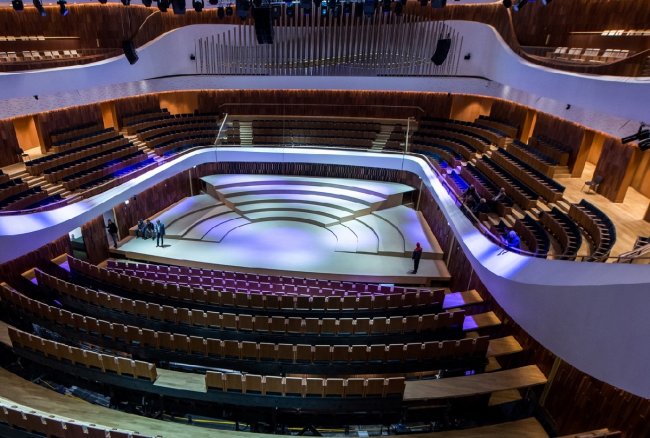 Московскии концертныи зал «Зарядье»В МКЗ «Зарядье» два зала. Большой зал рассчитан на 1600 мест, Малый — на 400 мест. Акустика залов создана ведущими специалистами компании Nagata Acoustics America Inc. Стены и потолок Большого и Малого залов отделаны акустическими панелями, в которых использован массив красного дерева махагони. Напольное покрытие сцены собрано из кедра особой породы, который обеспечит качественную акустику и необходимую реверберацию. Пол зрительского пространства зала выложен паркетной доской из дуба.