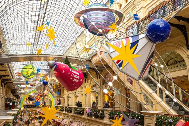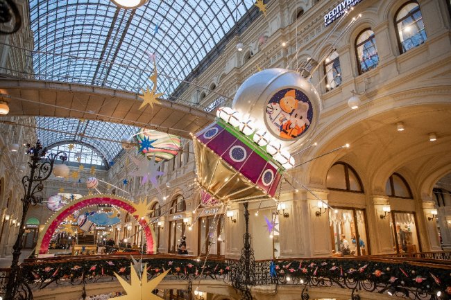 Новогодняя ярмарка в ГУМе 2019Тема оформления Главного универсального магазина приурочена к юбилею самой любимой детской программы «Спокойной ночи, малыши!», которой в этом году исполнилось 55 лет. Знакомые всем с детства герои: Хрюша, Степашка, Филя превратились в отважных космонавтов — ведь второй темой праздничного украшения ГУМа стал именно космос!