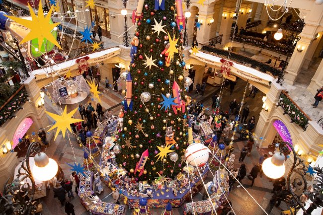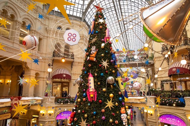 А главная ГУМовская елка, украшенная куклами из «Спокойной ночи, малыши!» и космическими ракетами, по традиции установлена в самом центре магазина. Здесь вовсю идет новогодний базар, на котором представлен огромный выбор праздничных украшений и подарков. И, конечно, на ярмарке вы найдете самые разнообразные вариации символа наступающего года — Крысы.