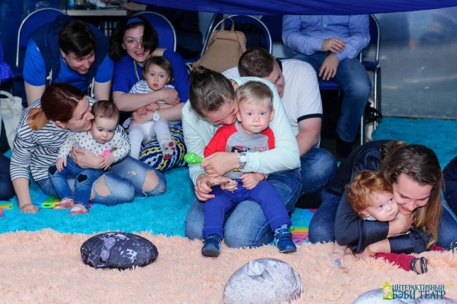Нет жестких неудобных театральных кресел. Дети с родителями сидят прямо на мягком теплом полу — так, как им самим удобно. Как дома! Сидя, лежа, на руках, обнимаясь.