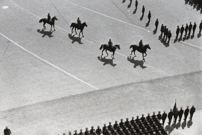Репрессивная политическая система, созданная Сталиным, контролировала и общественную, и личную жизнь каждого советского человека. Идеология превращала советский народ в послушное коллективное тело, и неслучайно на снимках Евзерихина так много шествий и парадов, в которых человек становился элементом узора, сотканного по замыслу постановщиков этих коллективных действий, призванных ежечасно подтверждать мощь, силу и красоту страны Советов.