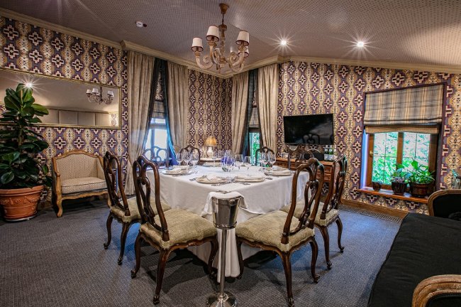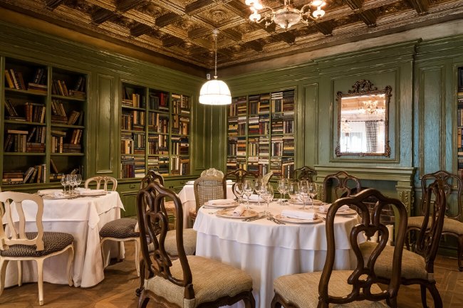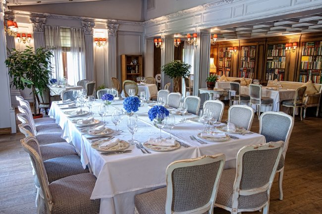 Ресторан «Butler»Эта эклектичная смесь делает интерьер и классическим, и актуальным, но, главное, поистине гостеприимным. Юна Мегре спланировала пространство ресторана таким образом, что оно легко трансформируется под празднование торжеств, будь то камерных посиделок в каминном зале на 20 человек или масштабных мероприятий с фуршетом на 130 персон. В глубине зала располагается импровизированная библиотека, за которой скрывается вход в бутик-отель.