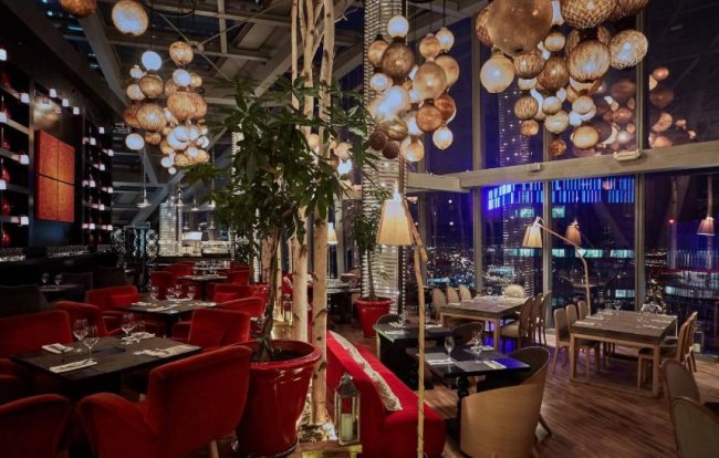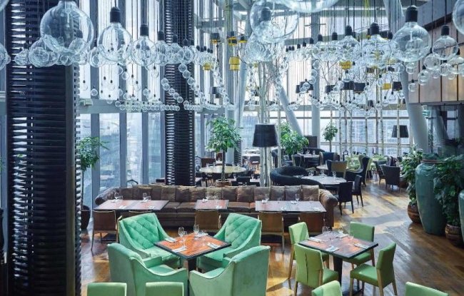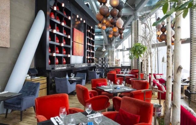 Ресторан «Sixty»Интерьер ресторана Sixty соответствует его месторасположению. Он выполнен в стиле современного урбанизма с явными нотами шестидесятых годов. Для оформления использованы яркие насыщенные тона в стиле Э. Уорхолла, который создает праздничную атмосферу. В ресторане Sixty окна в пол позволяют насладиться прекрасными видами, впрочем внутри заведения тоже есть на что посмотреть: роскошные светильники, необычно оформленные стены, стволы берез, которые находятся прямо в зале.