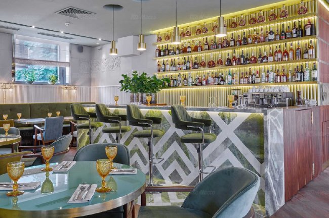 Стиль здесь доведен до совершенства — мрамор доставляли из лучших итальянских каменоломен, свет изготавливали по чертежам 50-х годов, а большая часть мебели, середины прошлого века, специально для Жеральдин подбирала в Европе и потом обновляла современными стилизованными тканями дизайнер Алина Ковалева из галереи «Палисандр». Даже французские книги и глянцевые журналы приехали на полки «Жеральдин» из Парижа — атмосфера должна соответствовать, и картина — быть полной.