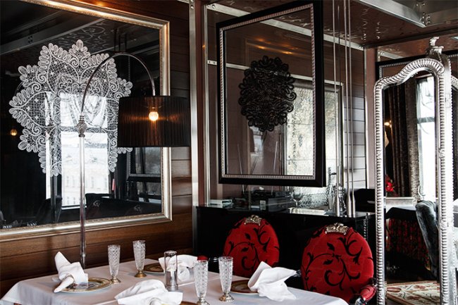 Интерьер ресторана оформлен в классическом стиле с преобладанием красного, черного, коричневого и белого цвета. Исконно русская тематика проглядывается в ярких скатертях с традиционными русскими узорами, а так же узорчатыми полом и потолком. Мягкая мебель создают не только атмосферу уюта в заведении, но и добавляют элементы роскоши в изысканный стиль ресторана.