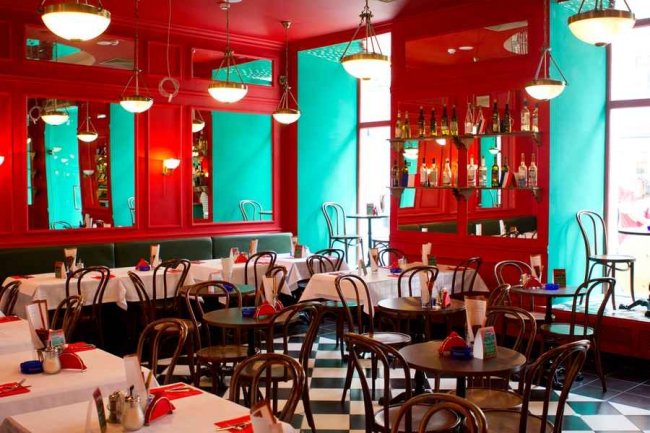 В кафе играет французский шансон, а официанты носят форму точь в точь как в истинных французских бистро — черные брюки и жилеты с белоснежными рубашками и фартуками «в пол». Новинки меню и события анонсируются на досках мелом. На столах бумажные скатерти и карандаши для творчества.