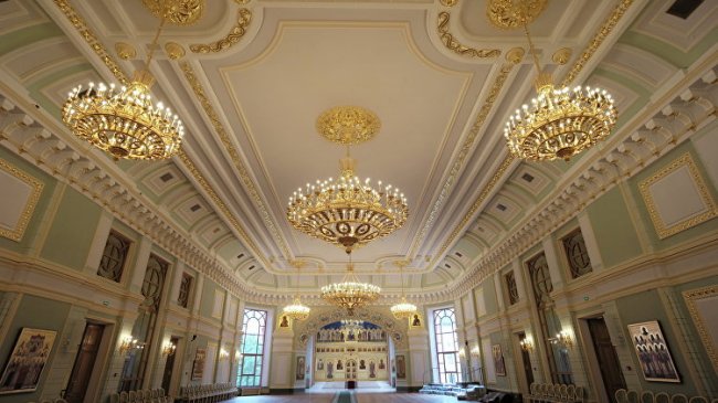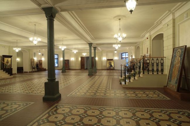 Соборная палата в ЛиховомЦветовое решение тоже было воспроизведено по старым фрагментам. Люстры изготовлены в Софрине, размеры не отличаются от первоначальных. Иконостас также восстановлен по фотографиям. Иконописный ряд выполнен выпускниками ПСТГУ. Реставрацию выполняло ООО «Пирит-99».