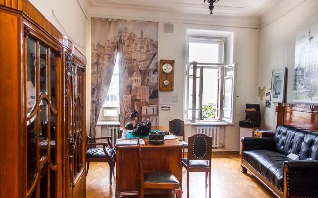 В самой комнате Булгакова, в его рабочем кабинете создавались такие произведения, как «Дьяволиада», «Записки юного врача», «Морфий», «Роковые яйца», «Белая гвардия». Писатель работал за столом с лампой, над которым расположена книжная полка со сфинксами. К комнате стоит диван, зеркало, походная кровать, стол и два шкафчика.